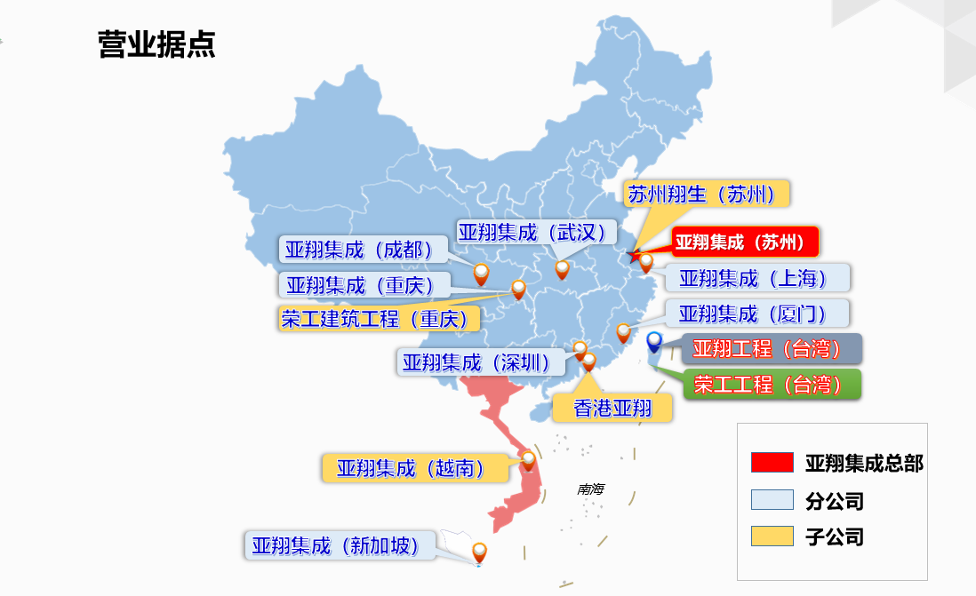1978年母公司亞翔工程成立,由基礎循序漸進的成長,跟隨臺灣地區工業的脈動,順應時空背景的轉變,調整經營觀念、開發新技術,在傳統的機電工程業中脫穎而出。2002年亞翔集成在蘇州成立,憑借領先的技術與現代化的管理,陸續在國內各地設立了分子公司。目前亞翔集成已成為一個起源于臺灣地區,扎根中國大陸,觸角延伸至新加坡、東南亞與中國大陸各地的跨國公司。未來力爭服務整個亞洲,乃至全球。